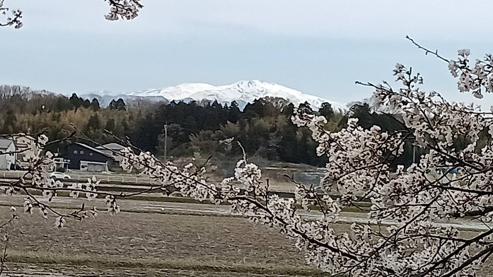 雪の残る白山と桜、